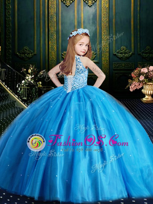 Home >  Special Occasion Dresses >  Cheap Flower Girl Dresses > Discount Halter Top Sequins Floor Length Ball Gowns Sleeveless Baby Blue Flower Girl Dress Lace Up
