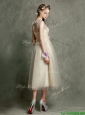 Discount  High Neck Champagne Prom Dresses  with Lace and Hand Made Flowers