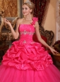 The hot pink quinceanera dress features a one shoulder strap above the sleeveless bodice in the front and a diagonal strap crossing the top back. It encrusted with appliques and beadings under the bust and around the waistline. The boubled skirt made of pick ups at the top part and layers of tulle at the botttom part, which shows a enchanting style you're sure to love.