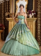 Stand out in the flounced skirt! This gorgeous chameleon fabric green quinceanera dress is featured with lotus leaves ornamented with exquisite appliques covering the bottom of the dress. The pleated dress at the lower part gives a distinctive outline. With the rushed bust area embraced with gold-plated bands, the bodice looks shiny and special. A perfect dress for youe sweet quinceanera!