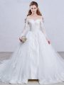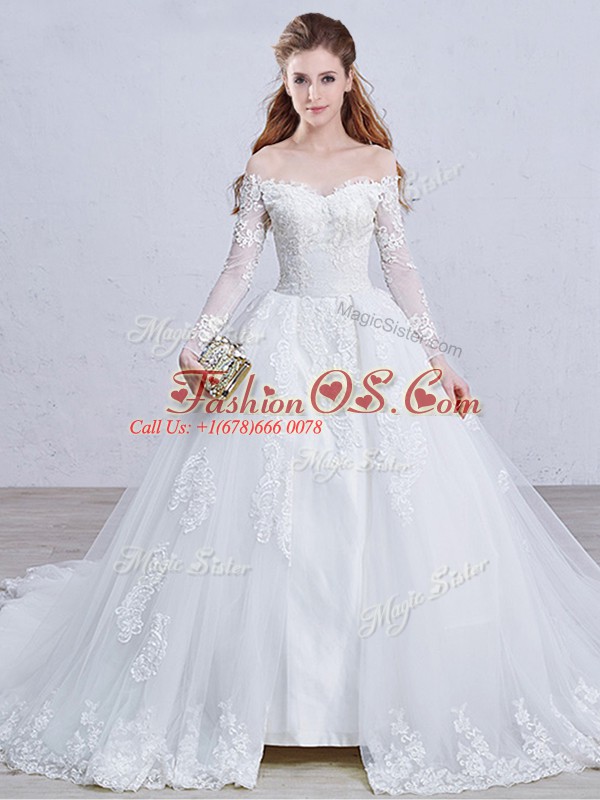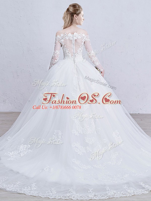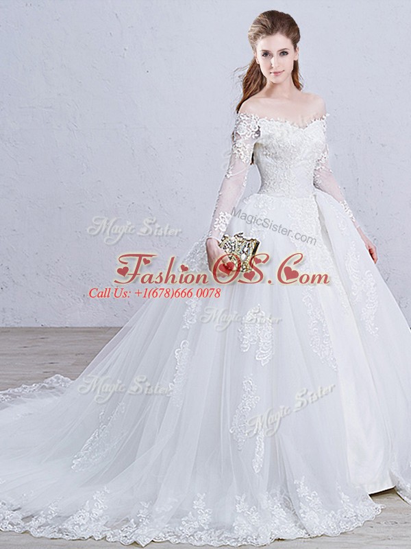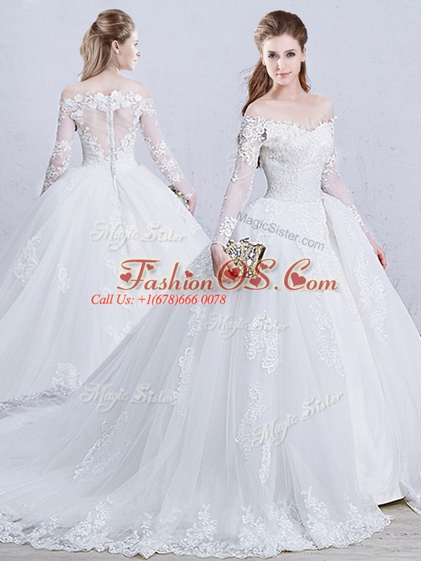 Discount Off The Shoulder Long Sleeves Tulle Wedding Gown Lace and Appliques Brush Train Zipper