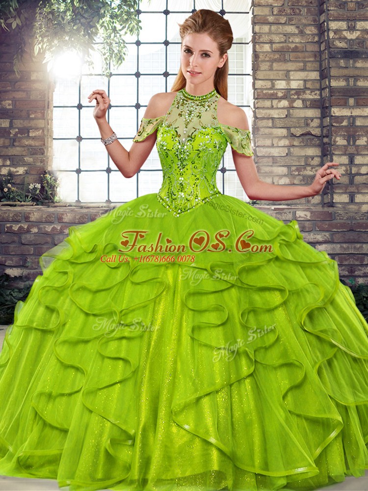 Discount Olive Green Tulle Lace Up Quinceanera Gown Sleeveless Floor Length Beading and Ruffles