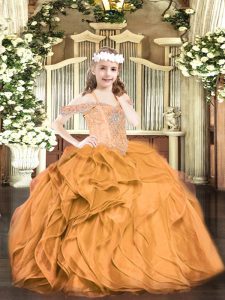 Home >  Special Occasion Dresses >  Pretty Little Girl Pageant Dresses > Discount Orange Red Organza Lace Up Kids Formal Wear Sleeveless Floor Length Beading and Ruffles