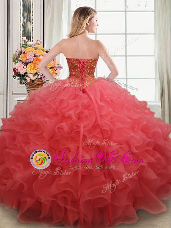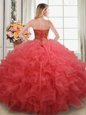 Discount Organza Sweetheart Sleeveless Lace Up Beading and Ruffles Sweet 16 Dresses in Coral Red