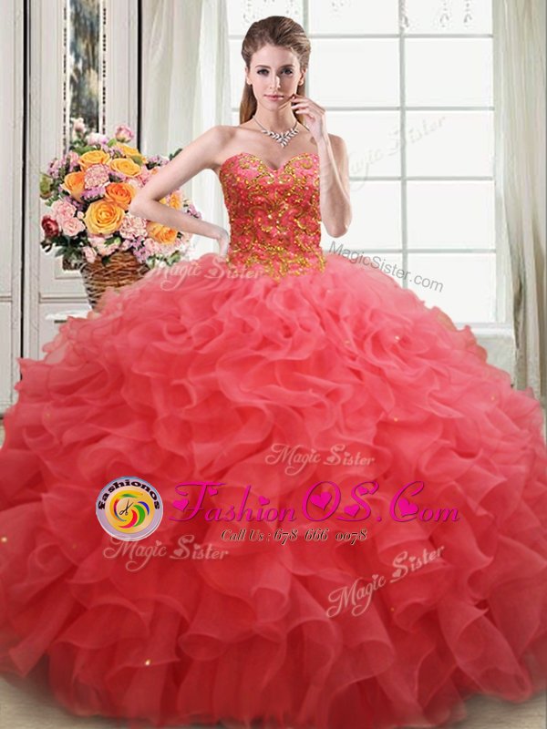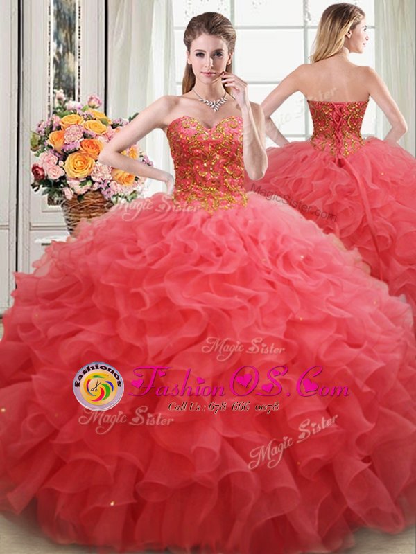 Home >  Quinceanera Dresses >  Fast Delivery Quinceanera Dresses > Discount Organza Sweetheart Sleeveless Lace Up Beading and Ruffles Sweet 16 Dresses in Coral Red