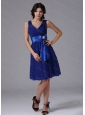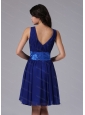 Are you joining in the party? Do you want to be the focus point, do you practice lone time? But now, the chance is coming, the moment good choice of dress is so important. The whole appearance is a soft chiffon royal blue short dress with a wide taffeta waistband accented with a larege bow. And the deep V-neckline and V shaped back will show your sexy bust and charming back that adds another dimension of beauty to an already lovely dress. A hidden zipper makes for easy off and on and secures the dress in place.This dress is a show stopper.