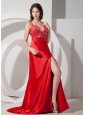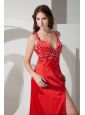 Red mother of the Bridal Dress will give you a night to remember. Sexy and elegant lines on this long sleeveless dress accentuates your curves. The shoulder straps are detailed with shinning beads that continues around to the bodice. The straps crisscross with a half open back give the dress a flirty and sexy look. The slited skirt show off your long and slim leg.On the back of the skirt,A light grasping gives the dress a ruching look and add the charm. Azipper up back is designed for the dress.