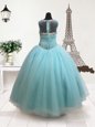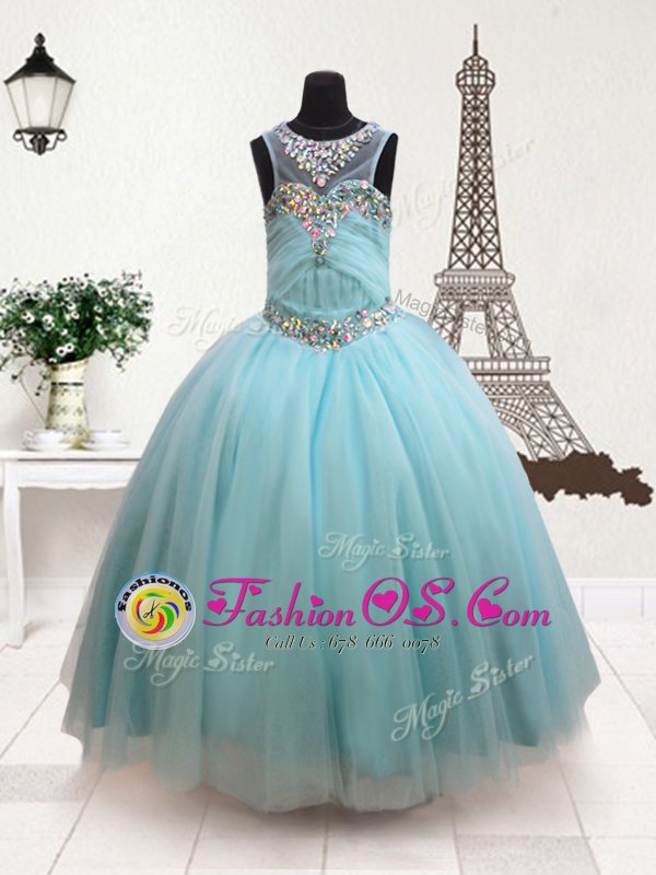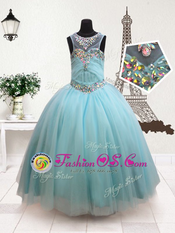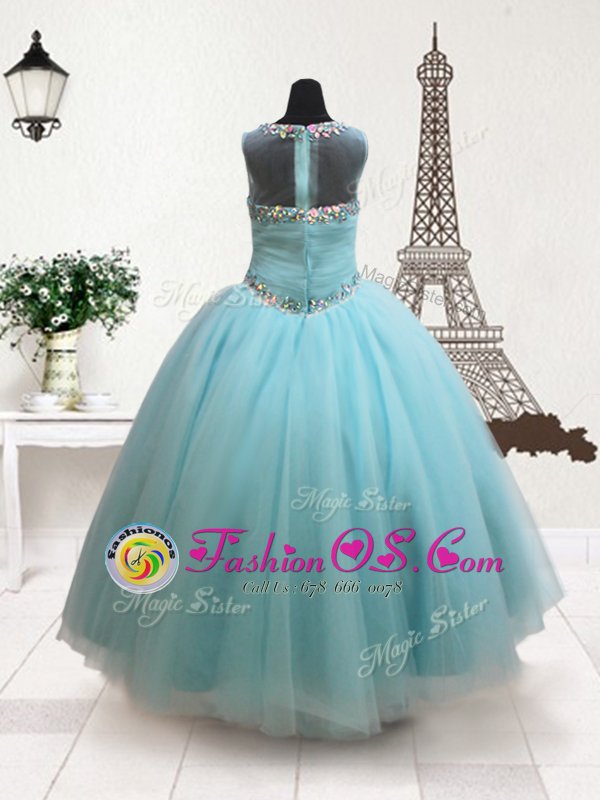 Discount Scoop Floor Length Zipper Toddler Flower Girl Dress Aqua Blue and In for Quinceanera and Wedding Party with Beading