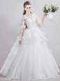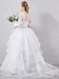 Discount Scoop White Half Sleeves Brush Train Lace and Ruffles With Train Wedding Dresses