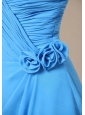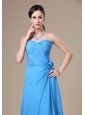 Gorgeous and glamorous are two words to perfectly describe this blue prom dress. It features a dainty sweetheart bodice that's heavily embellished with sophiscated wrapping ruching decorations. A lovely hand made floor features the side add the charm. The floor length skirt with a sassy slit in the side is so smooth and elegant that extends into a lovely brush train in the back. The zipper up in the back completes this fabulous design!