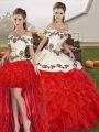 Discount White And Red Sweet 16 Dress Military Ball and Sweet 16 and Quinceanera with Embroidery and Ruffles Off The Shoulder Sleeveless Lace Up