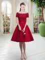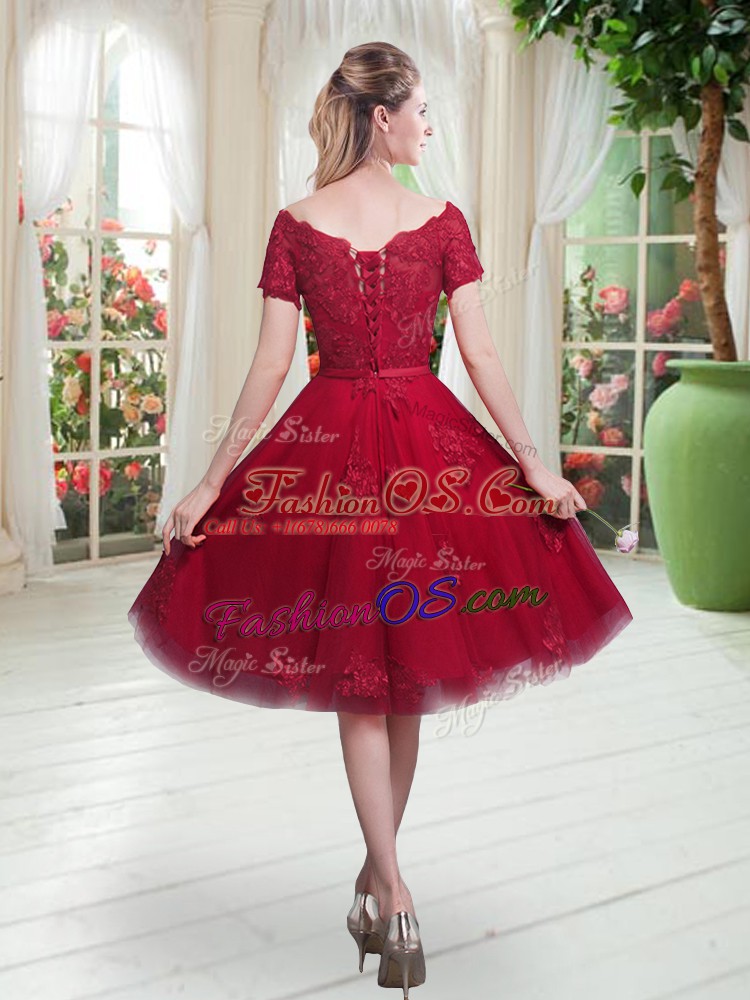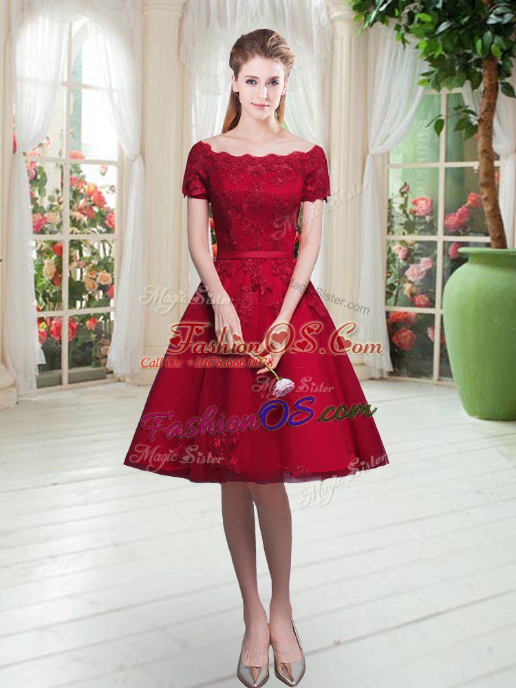 Discount Wine Red Short Sleeves Appliques Knee Length Evening Dress