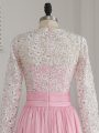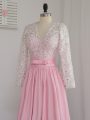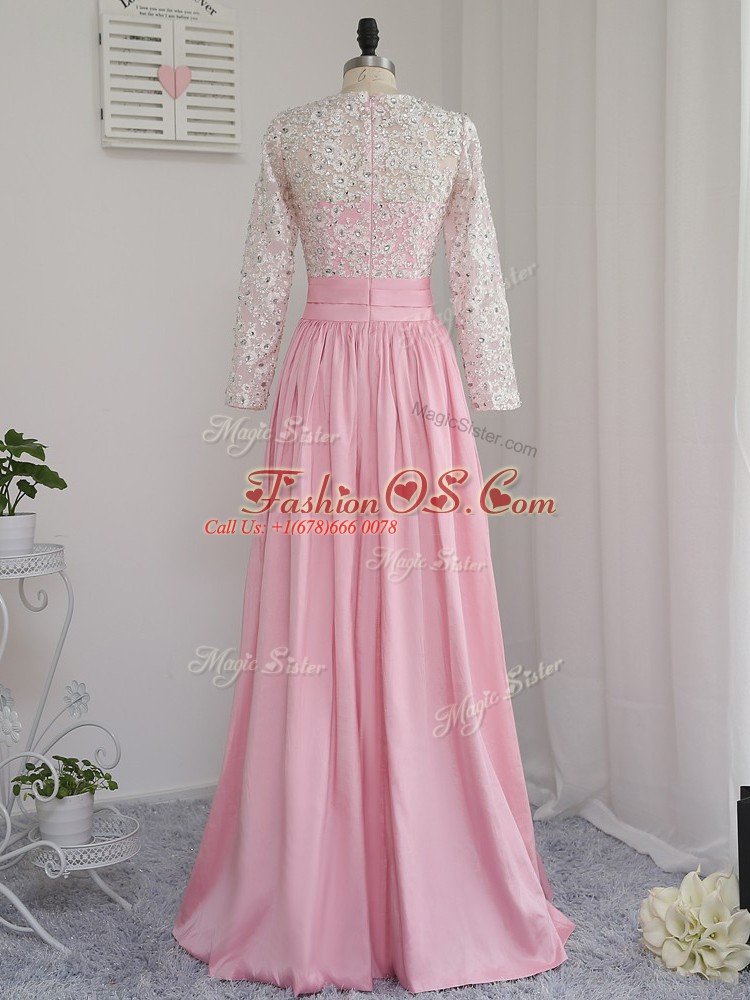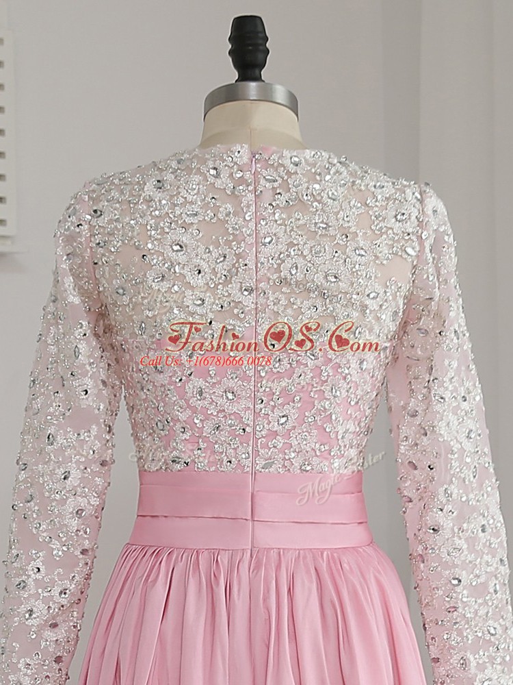 Dramatic Baby Pink Long Sleeves Floor Length Beading Zipper Homecoming Dress