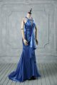 Home >  Evening Dresses > Dramatic Blue Mermaid Beading and Ruching Evening Wear Criss Cross Elastic Woven Satin Sleeveless