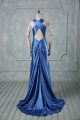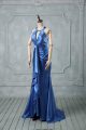 Dramatic Blue Mermaid Beading and Ruching Evening Wear Criss Cross Elastic Woven Satin Sleeveless