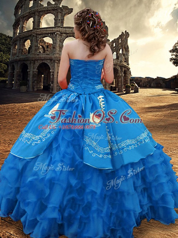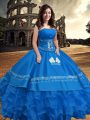 Dramatic Blue Sleeveless Embroidery and Ruffled Layers Floor Length Quince Ball Gowns