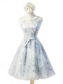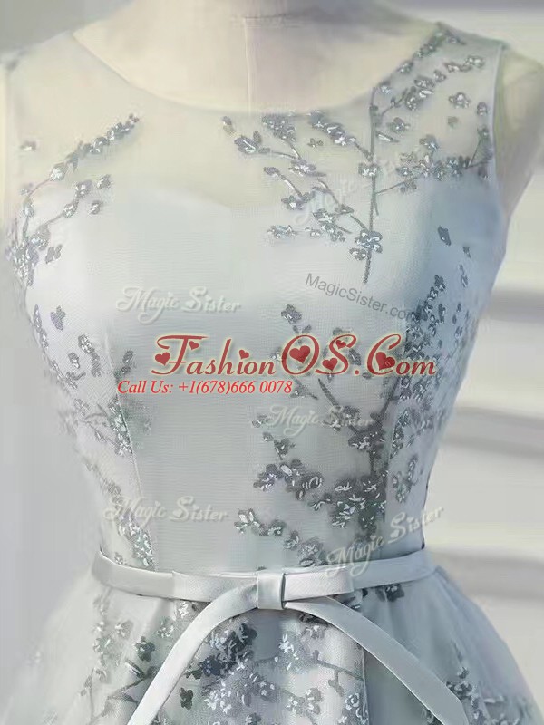 Dramatic Grey A-line Organza Scoop Sleeveless Lace and Appliques and Belt Mini Length Lace Up Cocktail Dresses