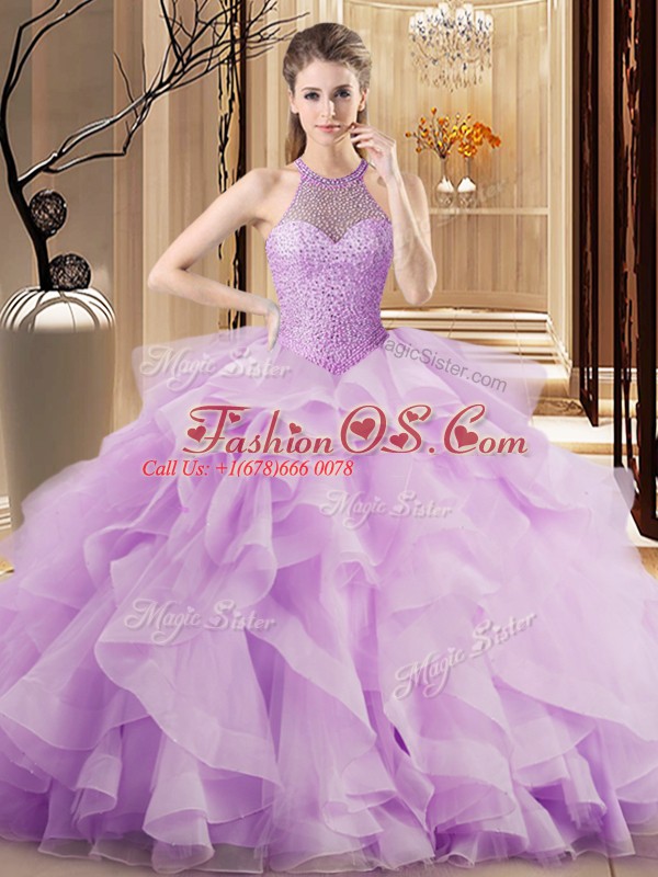 Dramatic Halter Top Sleeveless Brush Train Lace Up Quinceanera Gown Lilac Organza