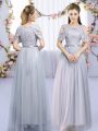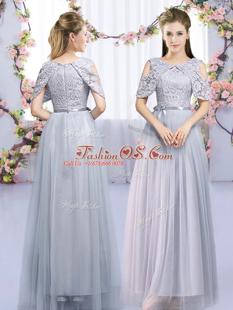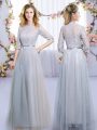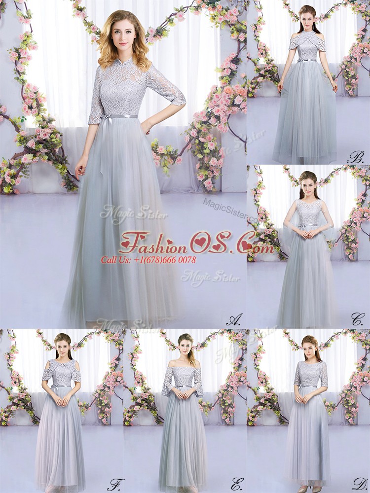 Dramatic Lace and Belt Damas Dress Grey Zipper Half Sleeves Floor Length