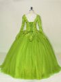 Dramatic Olive Green Ball Gowns Tulle V-neck Long Sleeves Lace and Appliques Side Zipper Quince Ball Gowns
