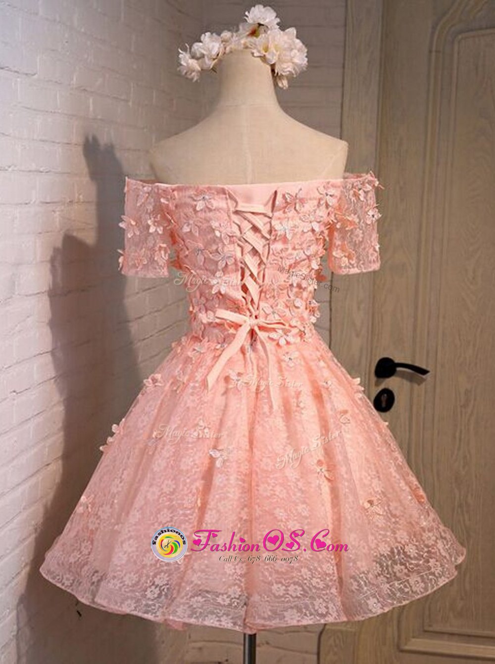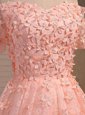 Dramatic Peach A-line Off The Shoulder Sleeveless Lace Mini Length Lace Up Appliques Prom Dress