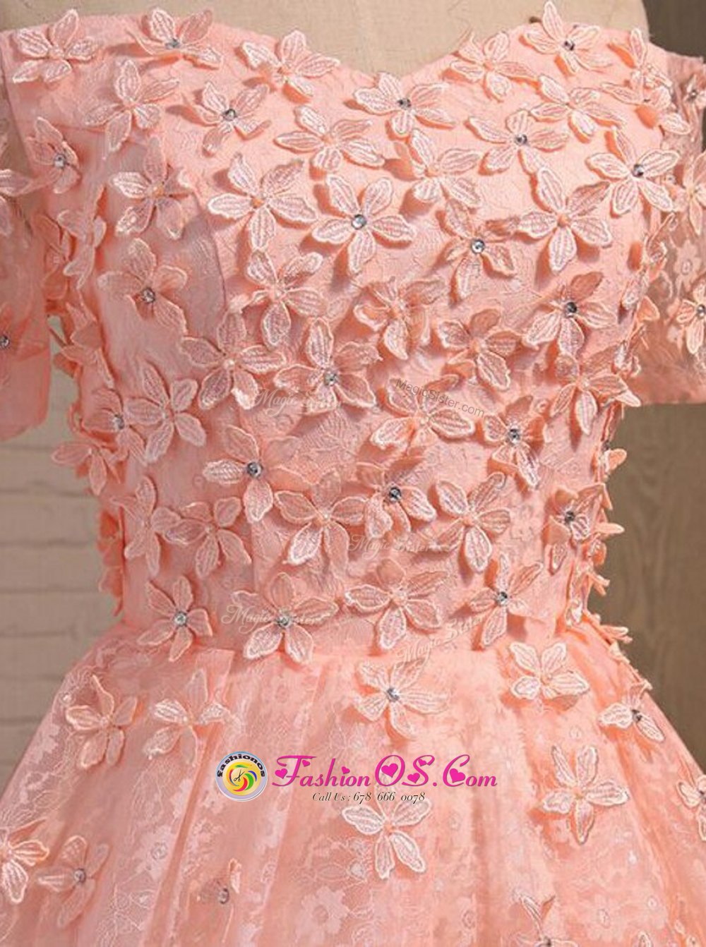 Home >  Prom Dresses >  Prom Dresses On Sale > Dramatic Peach A-line Off The Shoulder Sleeveless Lace Mini Length Lace Up Appliques Prom Dress