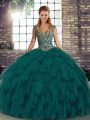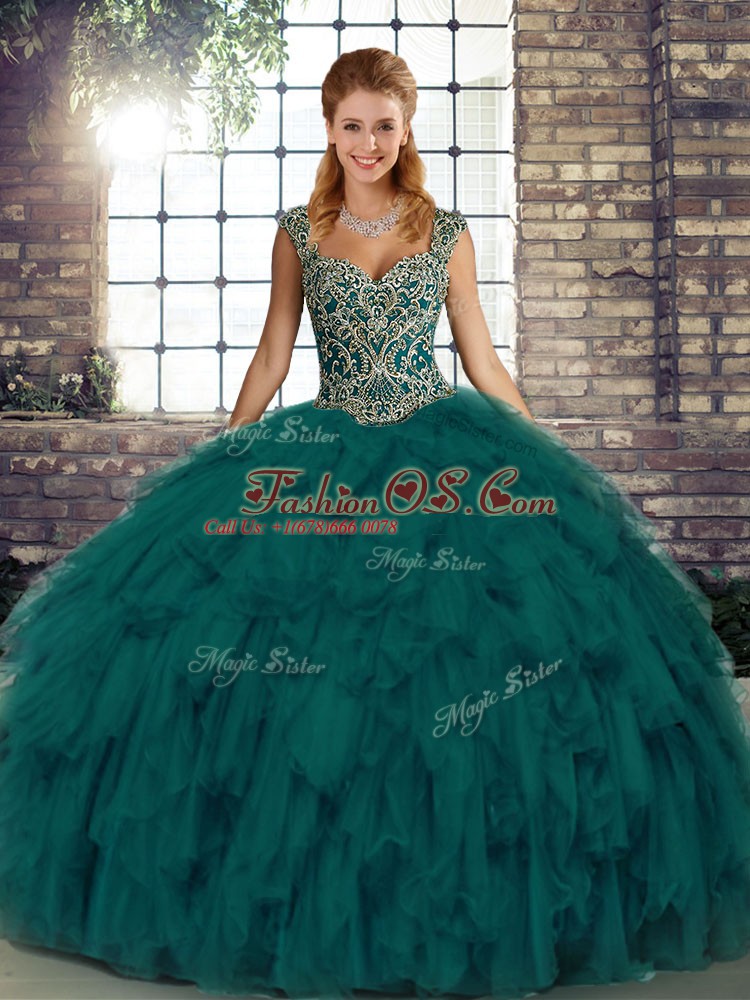 Dramatic Peacock Green Sweet 16 Dress Military Ball and Sweet 16 and Quinceanera with Beading and Ruffles Straps Sleeveless Lace Up