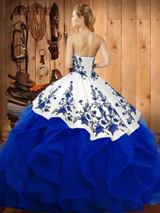 Dramatic Satin and Organza Sweetheart Sleeveless Lace Up Embroidery and Ruffles 15th Birthday Dress in Blue