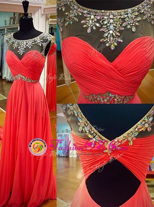 Home >  Prom Dresses >  Fashionable Prom Dresses > Dramatic Scoop Sashes|ribbons Coral Red Backless Sleeveless Floor Length