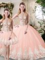 Dramatic Sleeveless Floor Length Beading and Lace and Appliques Backless 15 Quinceanera Dress with Peach