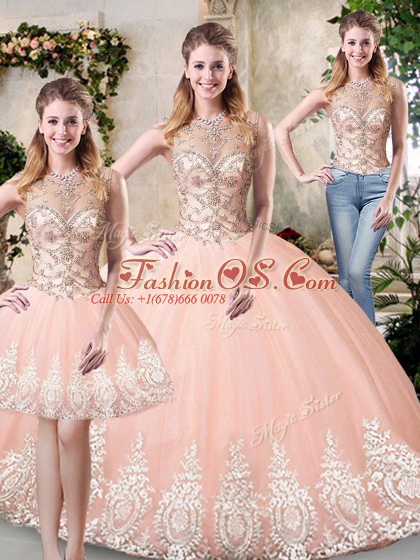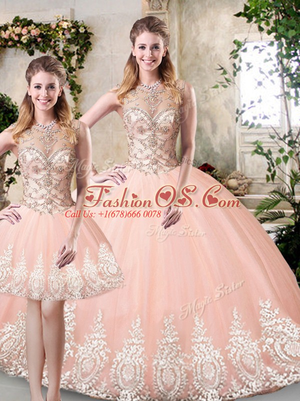 Home >  Quinceanera Dresses >  Detachable Quinceanera Skirts > Dramatic Sleeveless Floor Length Beading and Lace and Appliques Backless 15 Quinceanera Dress with Peach