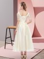 Dramatic Tea Length Champagne Bridesmaid Gown Scoop Short Sleeves Lace Up
