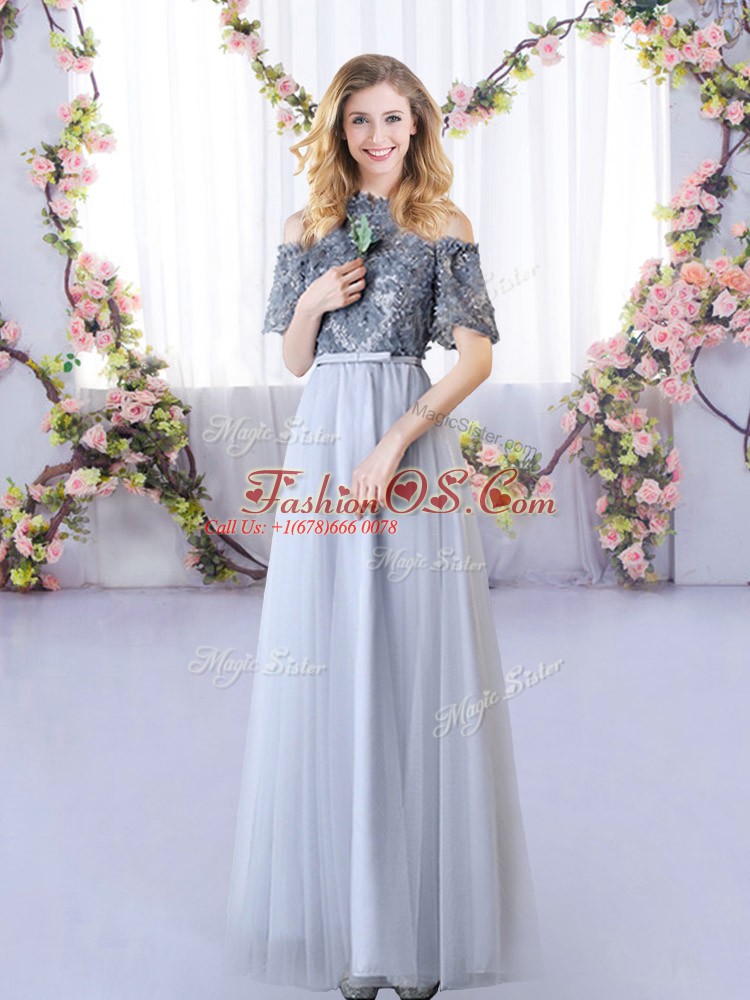 Dramatic Tulle Short Sleeves Floor Length Bridesmaid Dress and Appliques