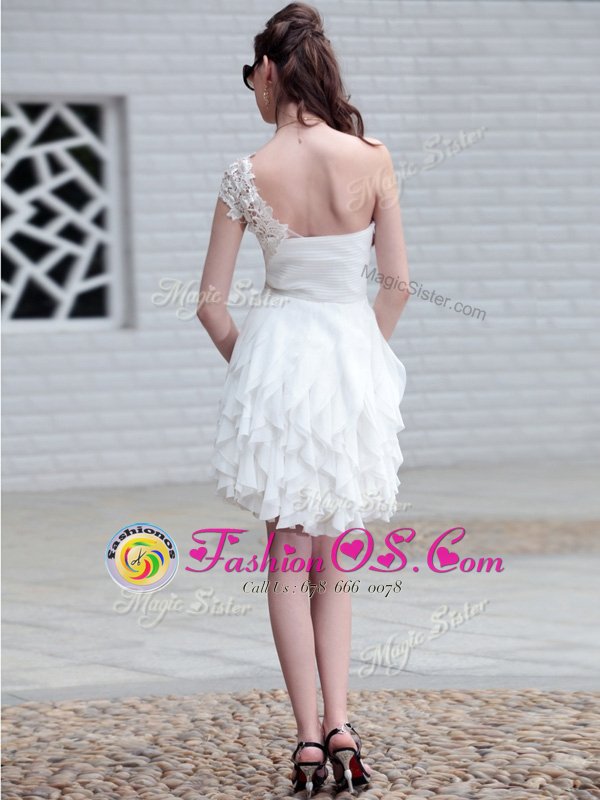 Dramatic White One Shoulder Neckline Lace and Ruffles Prom Party Dress Sleeveless Zipper