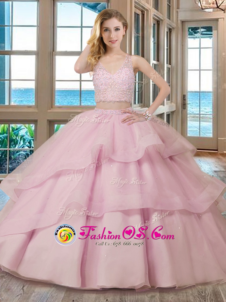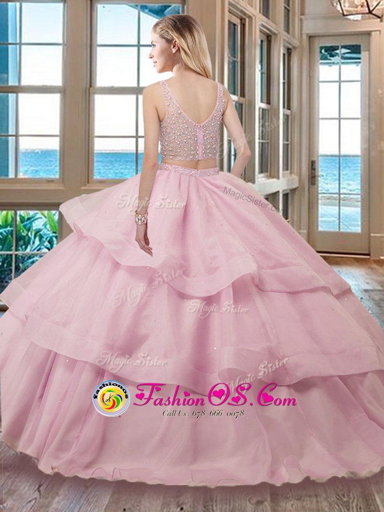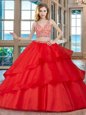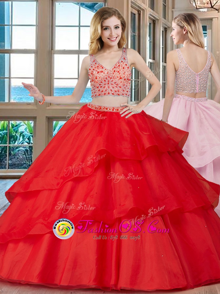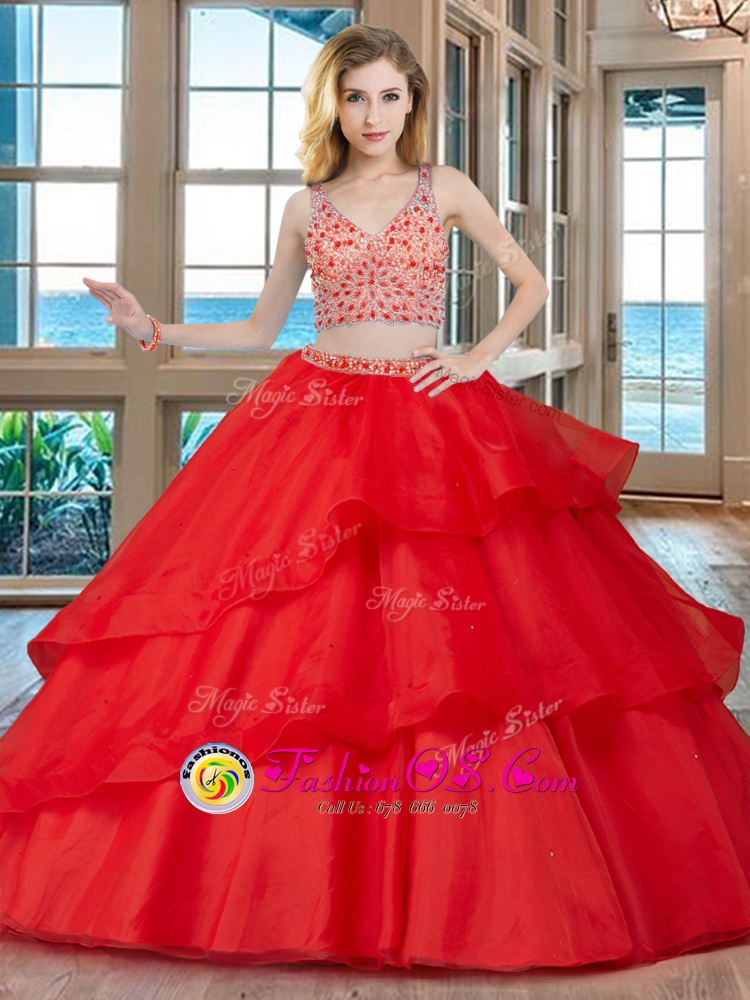 Dramatic With Train Red Quince Ball Gowns Organza Brush Train Sleeveless Beading