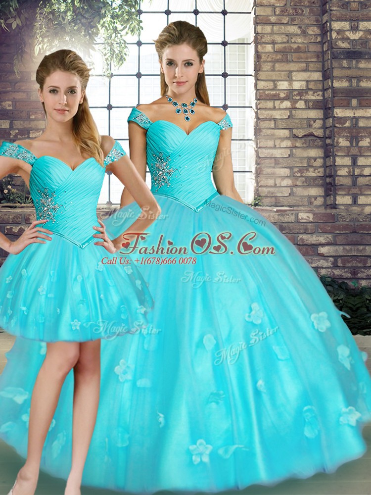 Home >  Quinceanera Dresses >  Detachable Quinceanera Skirts > Dynamic Aqua Blue Tulle Lace Up Off The Shoulder Sleeveless Floor Length Quinceanera Dress Beading and Appliques