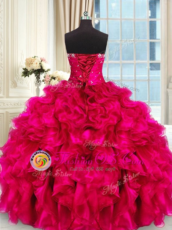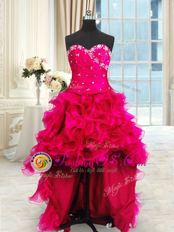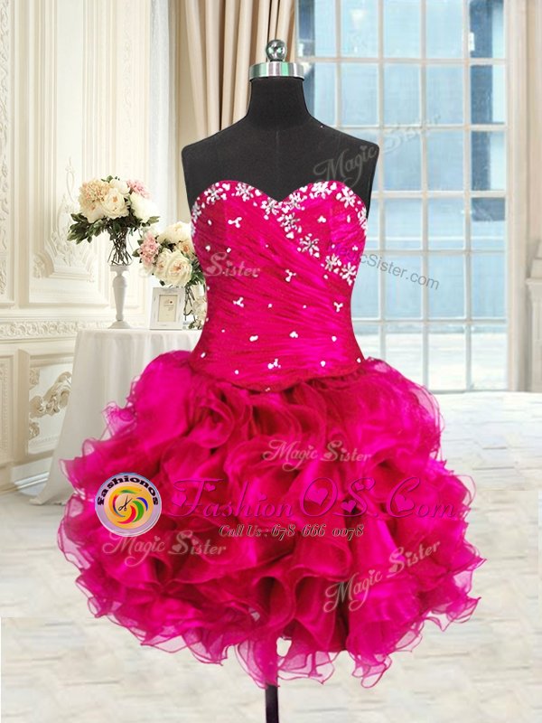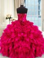 Dynamic Four Piece Hot Pink Sleeveless Beading and Ruffles and Ruching Floor Length Ball Gown Prom Dress