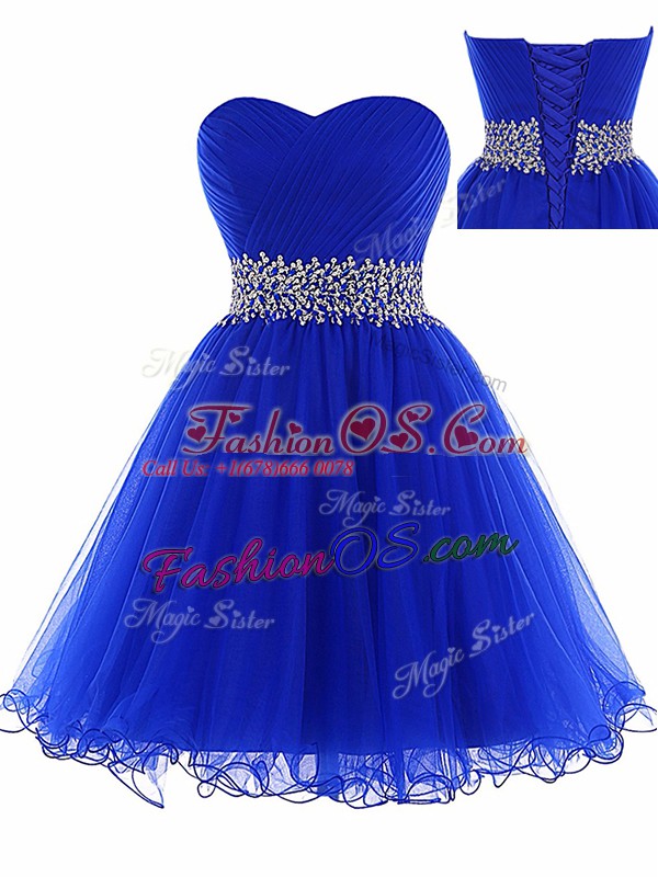 Dynamic Royal Blue Tulle Lace Up Sweetheart Sleeveless Mini Length Teens Party Dress Ruching