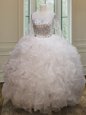 Home >  Quinceanera Dresses >  Unique Quinceanera Dresses > Dynamic Scoop See Through White Ball Gowns Beading and Ruffles Quinceanera Dresses Lace Up Organza Long Sleeves Floor Length
