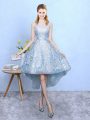 Edgy A-line Wedding Guest Dresses Light Blue Scoop Tulle and Printed Sleeveless High Low Zipper