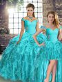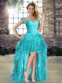 Edgy Aqua Blue Three Pieces Organza Off The Shoulder Sleeveless Beading and Ruffles Lace Up Sweet 16 Dresses Brush Train