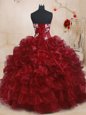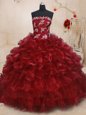 Edgy Burgundy Ball Gowns Strapless Sleeveless Organza Floor Length Lace Up Beading and Ruffles and Ruffled Layers Quince Ball Gowns