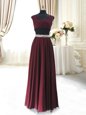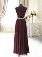 Edgy Burgundy V-neck Zipper Beading and Belt Prom Evening Gown Cap Sleeves