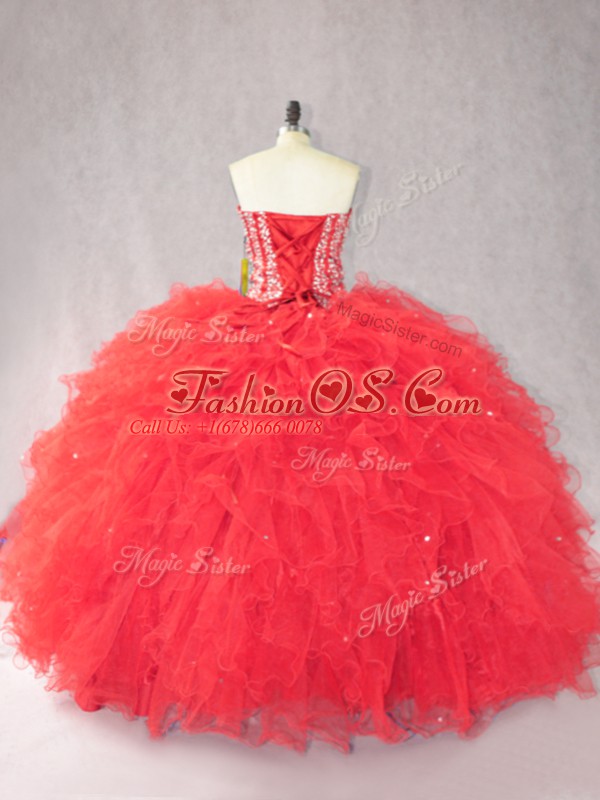 Edgy Floor Length Red Quince Ball Gowns Tulle Sleeveless Beading and Ruffles