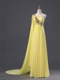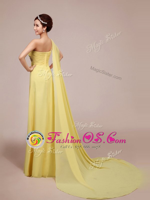 Edgy One Shoulder Appliques and Ruching Evening Dress Light Yellow Zipper Sleeveless With Train Sweep Train