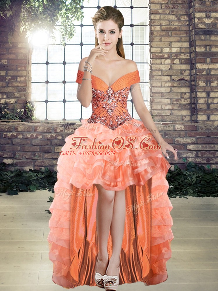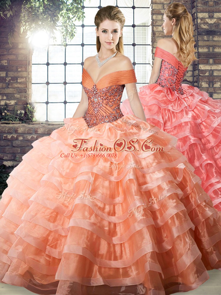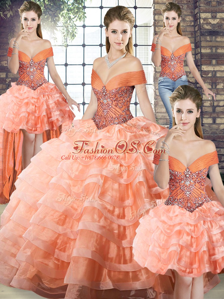 Home >  Quinceanera Dresses >  Detachable Quinceanera Skirts > Edgy Peach Sleeveless Beading and Ruffled Layers Lace Up Quinceanera Dresses