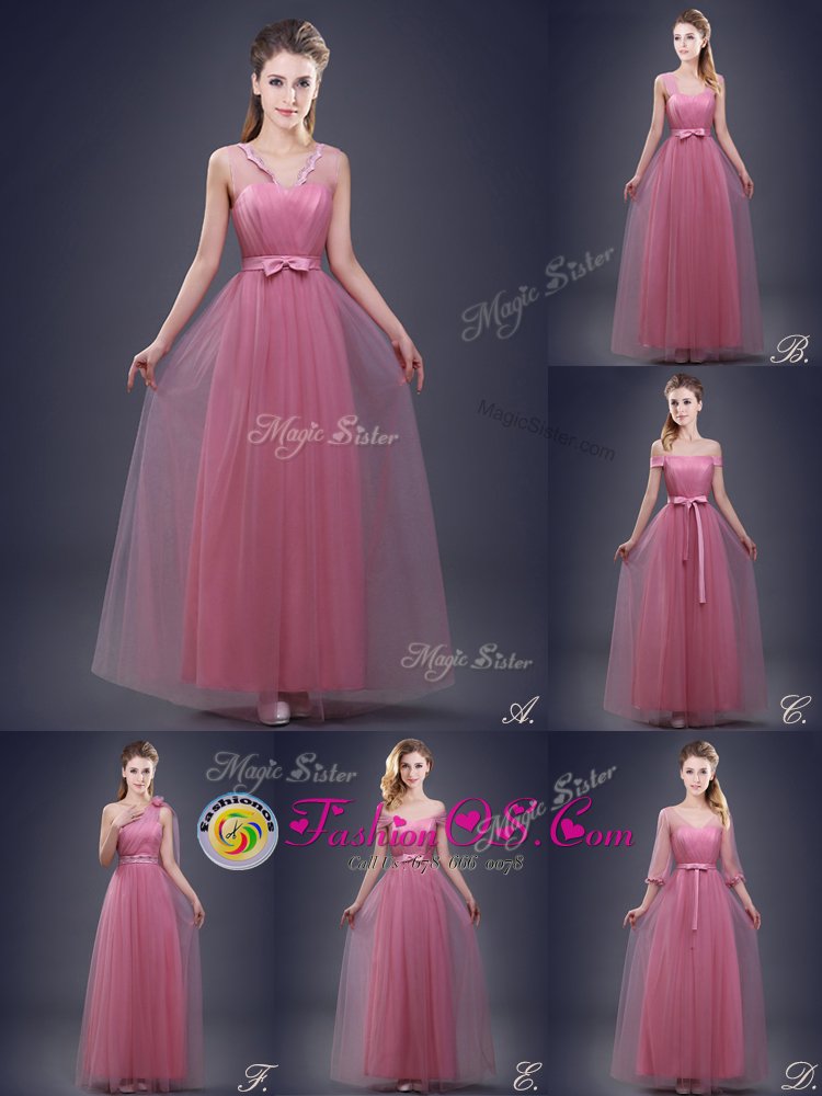 Home >  Bridesmaid Dresses >  Cheap Bridesmaid Dresses > Edgy Pink Empire Tulle Straps Sleeveless Ruching and Bowknot Floor Length Lace Up Bridesmaid Dresses