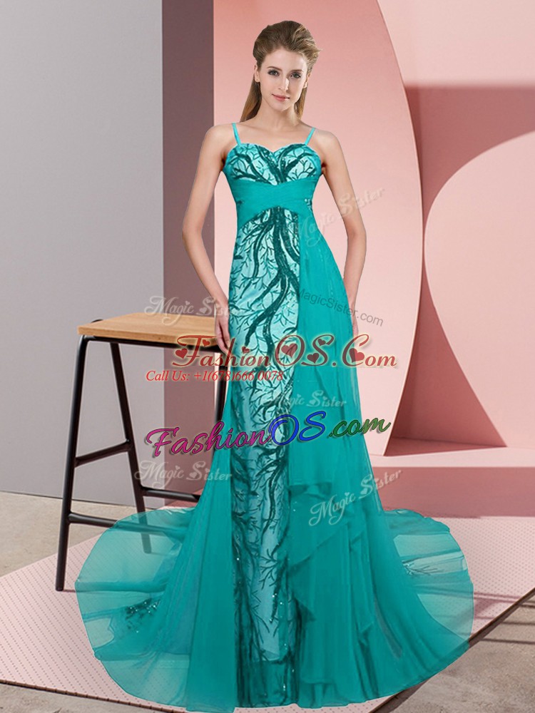 Edgy Tulle Spaghetti Straps Sleeveless Sweep Train Zipper Beading and Lace Prom Dress in Teal