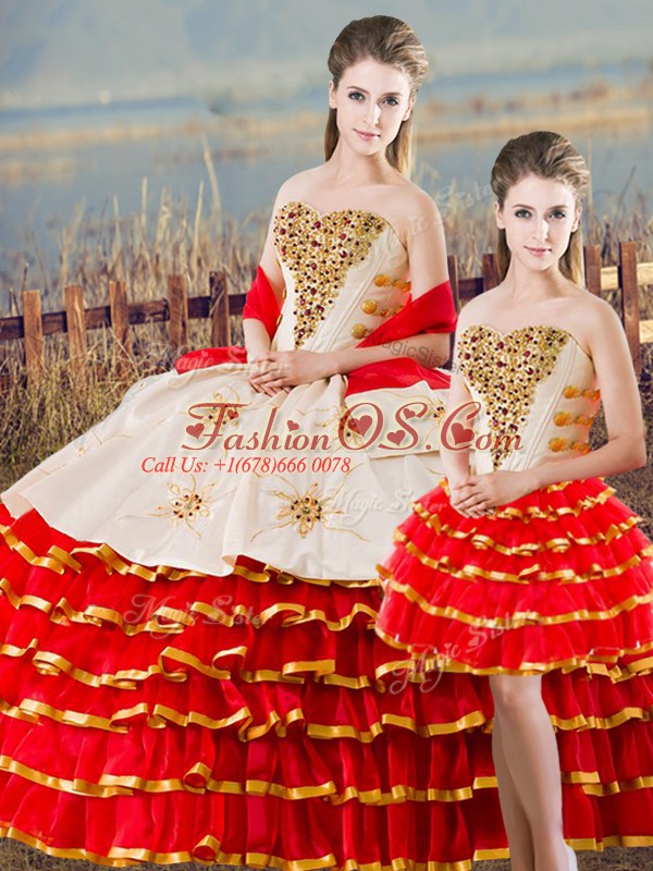 Edgy White And Red Sleeveless Floor Length Beading and Ruffled Layers Lace Up Sweet 16 Dress