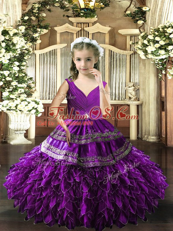 Home >  Special Occasion Dresses >  Beautiful Kids Pageant Dresses > Eggplant Purple Backless Pageant Dress Wholesale Beading and Appliques and Ruffles and Ruching Sleeveless Floor Length